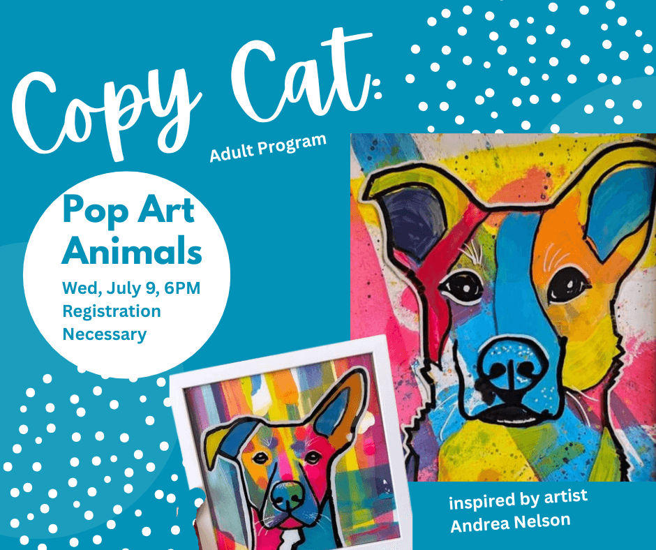 This is a monthly crafting program for adults. We explore a new project each month. This month we are trying our hand with Pop Art Animal Pictures. Our inspiration is artist Andrea Nelson. Registration is necessary for this free program.