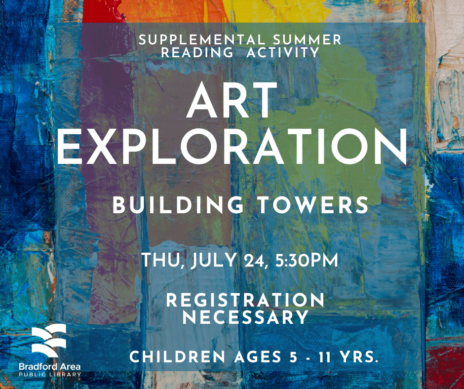 Courtney Mealy is returning to lead another Art Exploration program for students aged 5 - 11 yrs. old. Young artists will use wooden skewers and other materials to create unique 3-D sculptures. Registration is necessary.