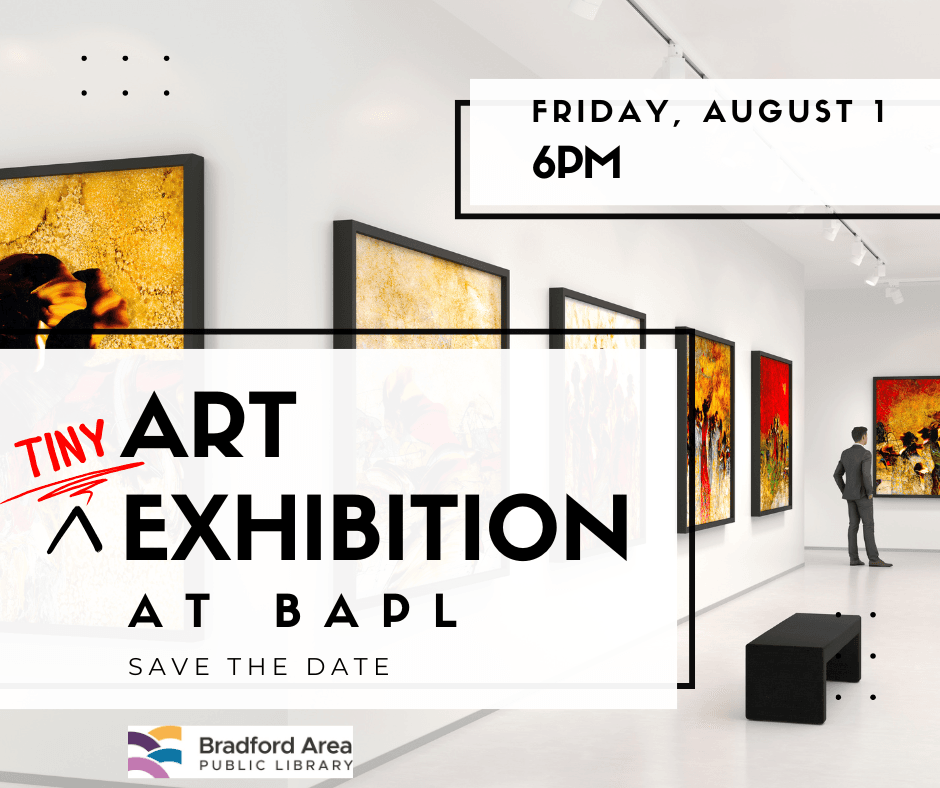BAPL's Community Room will be transformed into an Art Gallery on Friday, August 1st. Area adults are invited to attend our first Tiny Art Exhibition, where attendees are sure to marvel at the masterpieces that have been created on 4"x4" canvases! While enjoying the art and meeting the artists, attendees (aged 21+ yrs) can also purchase a glass of wine (proceeds benefit BAPL programming).