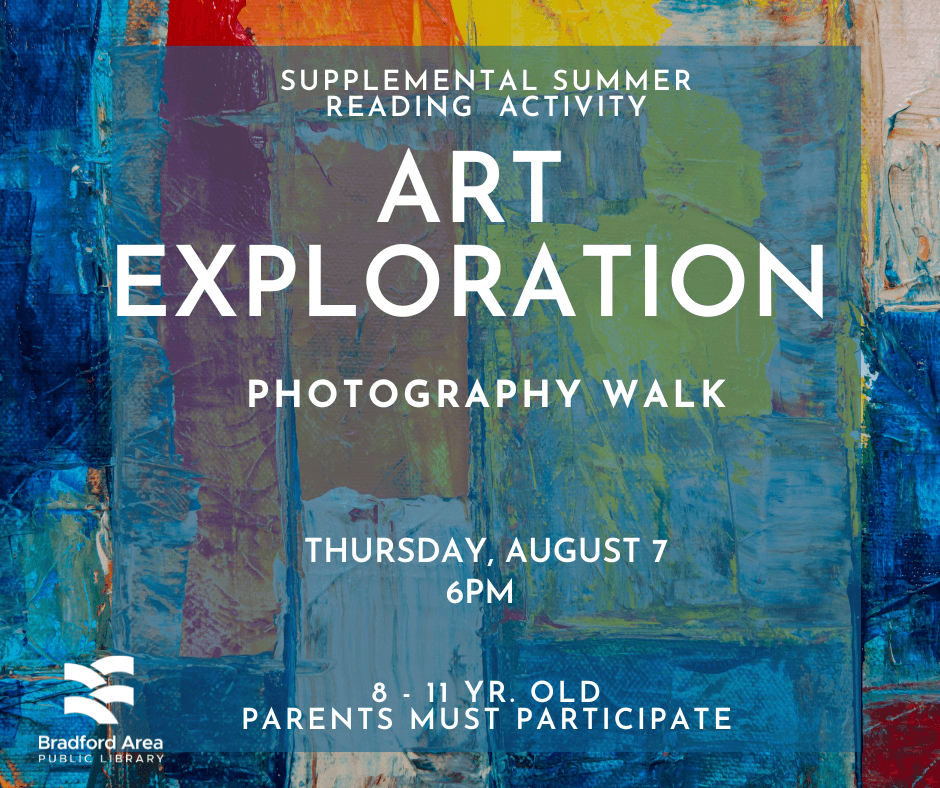 This children's event is designed for students aged 8 - 11 yrs old. Participants will look at books on photography, then they will stroll around town with a parent and take photos using their parent's cell phone. Pictures will then be sent to BAPL (email) to be printed. Printed photos will be used in the next Art Exploration program on August 14. Participants are asked to register/commit to both sessions. An adult must accompany each child during this session.