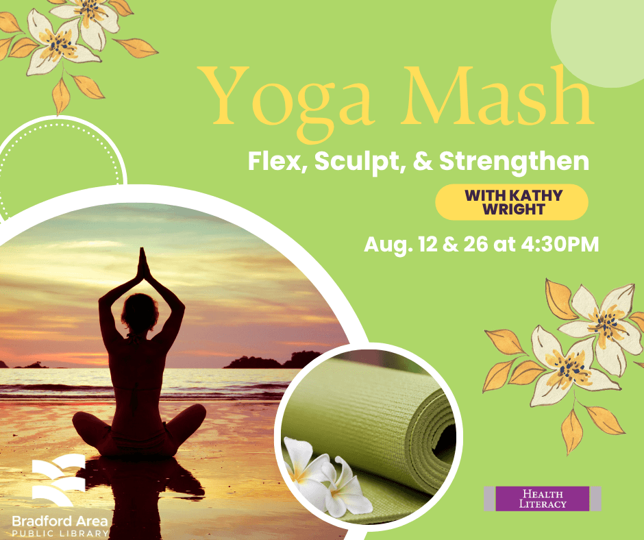 Local yoga instructor, Kathy Wright will lead a yoga series that will increase your flexibility while sculpting and strengthening your body. Participants will use a combination of yoga mats, small weights, and chairs. This free Adult program is perfect for people of all abilities and ages. Each 45 minute session begins at 4:30PM. No Registration Necessary.