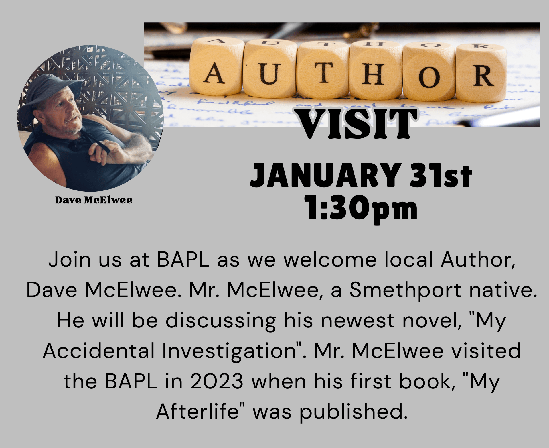 Mr. McElwee, a Smethport native. He will be discussing his newest novel, "My Accidental Investigation". Mr. McElwee visited the BAPL in 2023 when his first book, "My Afterlife" was published.