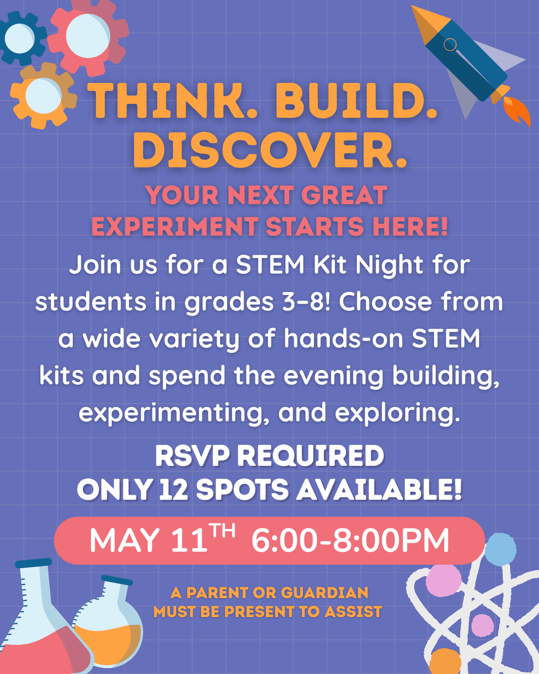 Your next great experiment starts here! Join us for a STEM Kit Night for students in grades 3–8! Choose from a wide variety of hands-on STEM kits and spend the evening building, experimenting, and exploring. A parent or guardian must be present to assist